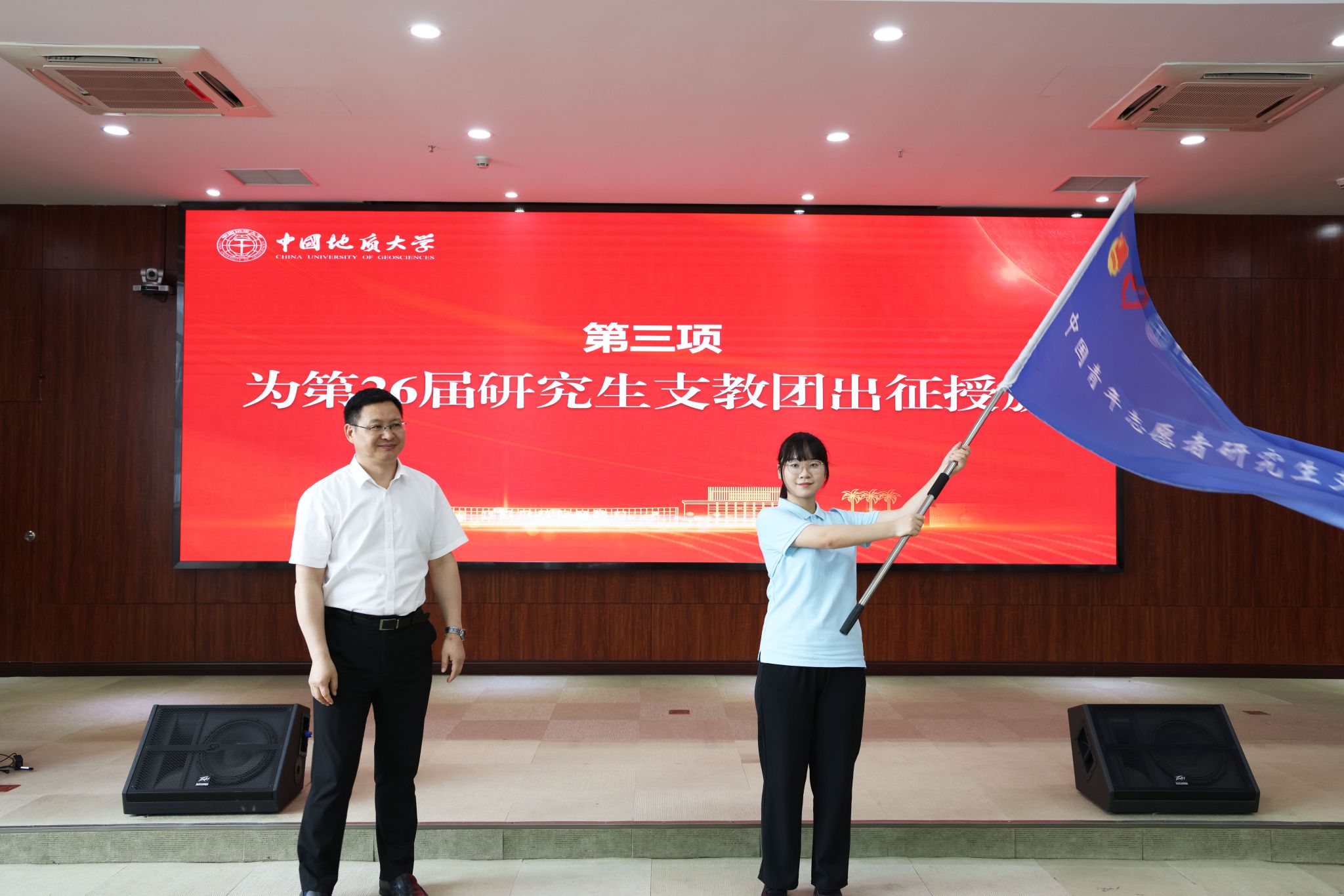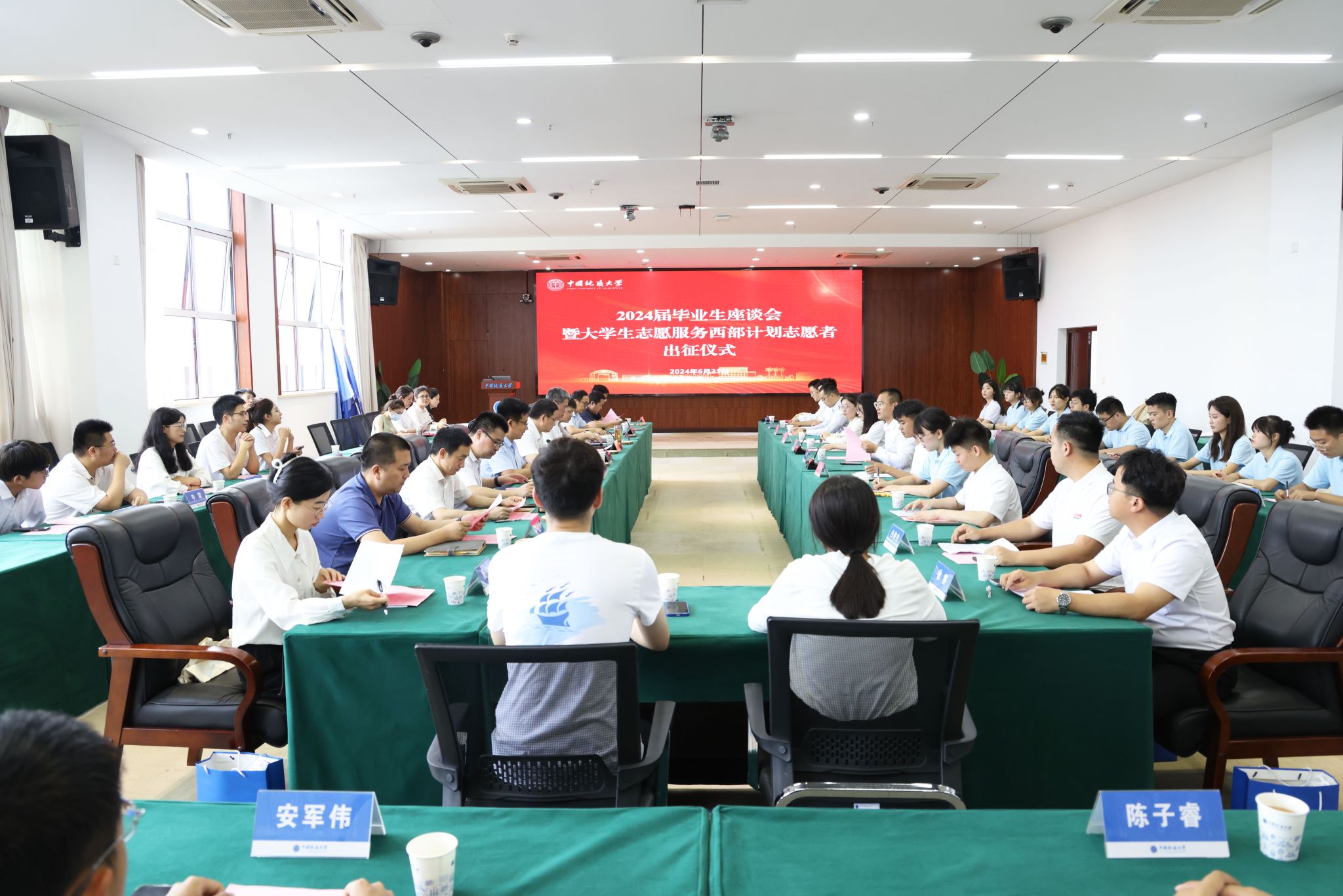 地大新聞網訊 (通訊員 楊書睿 周汝霖 郭小玉 攝影 孫彥欽)6月21日,我校2024屆畢業生座談會暨大學生志愿服務西部計劃志愿者出征儀式在東區教學綜合樓A708舉行。校黨委書記劉杰,副校長王華,相關管理與服務單位負責人、2024屆優秀畢業生代表、西部計劃志愿者及第26屆研究生支教團參加會議。校團委書記朱丹主持會議。