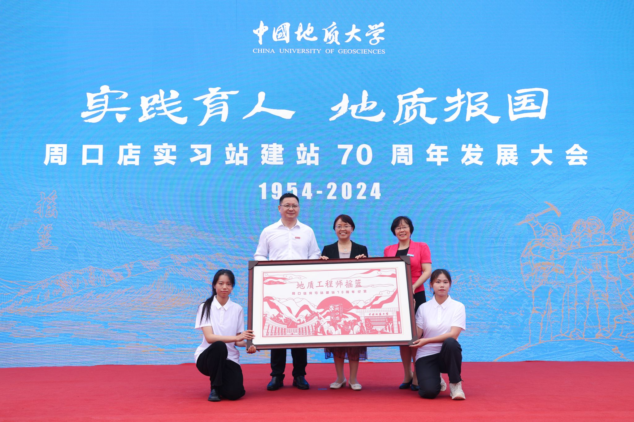 中國地質大學(武漢)校長李建威、中國地質大學(北京)校長孫友宏向周口店實習隊隊長贈予紀念品。