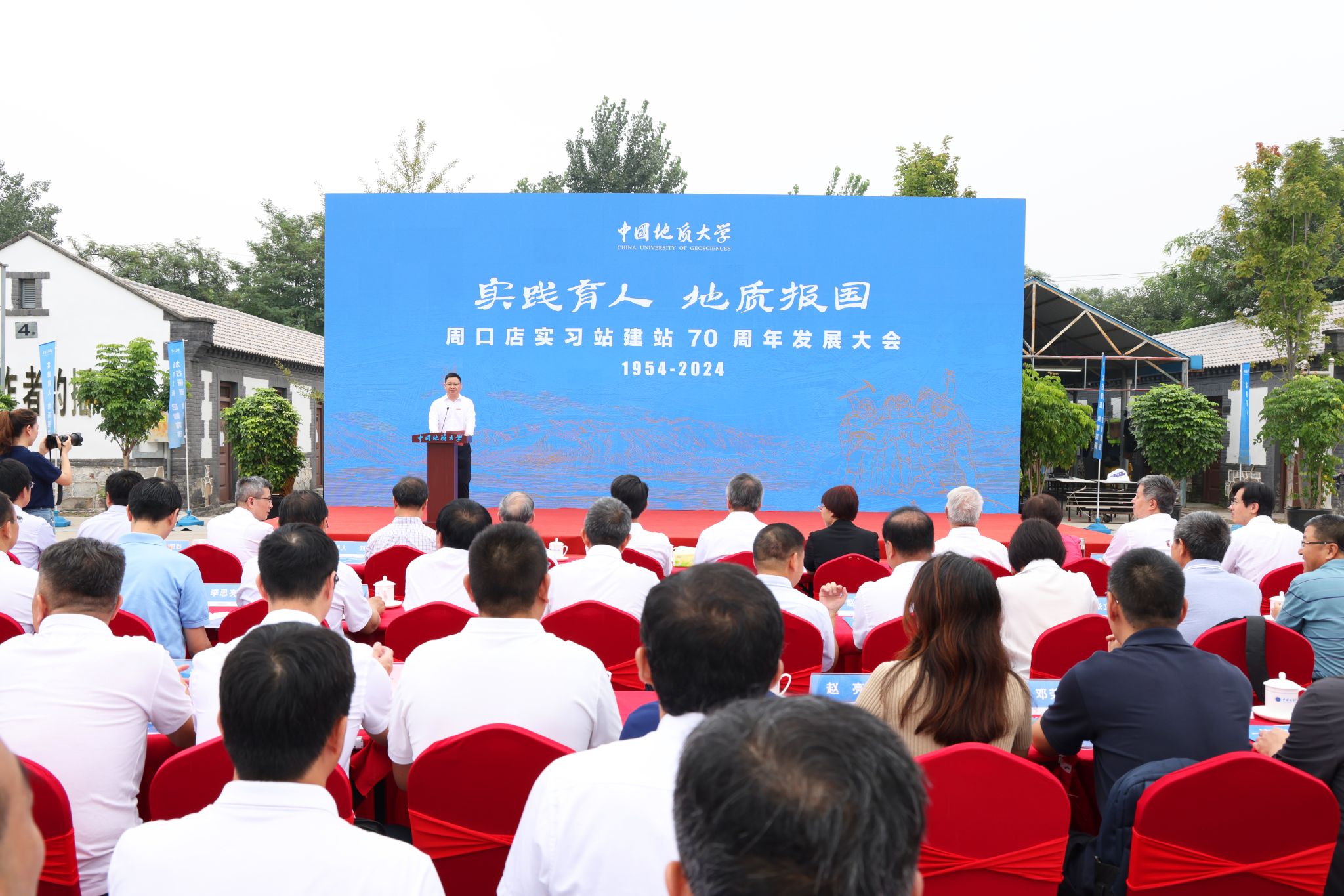 地大新聞網訊 (記者 王俊芳 孫彥欽 焦思勤)8月9日,中國地質大學周口店實習站建站70周年發展大會在周口店實習站舉行。中國科學院院士、中國地質大學教授殷鴻福、金振民,中國工程院院士、中國地質大學(北京)校長孫友宏,中國工程院院士、寧波大學教授杜時貴,教育部高等教育司副司長高東鋒,自然資源部中國地質調查局黨組成員、副局長顏成義,北京市房山區副區長鄭海濤,北京市房山區文化和旅游局局長梁義國,北京市周口店鎮副鎮長張淑娟,北京城建集團總工程師李久林,北京建機資產經營有限公司黨委書記、執行董事王海濤,北京建機資產經營有限公司黨委副書記侯濤,南京大學副校長陸現彩,成都理工大學副校長曾國強,河北地質大學副校長趙永強,中國地質大學(北京)校領導雷涯鄰、林善園、趙志丹,中國地質大學(武漢)校領導劉杰、李建威、王林清,原副校長賴旭龍,黨委常委、黨委組織部部長陳文武,校長助理蔣少涌,教育部、自然資源部、北京市房山區有關部門負責人,北京大學、天津大學、吉林大學、中國礦業大學、中國礦業大學(北京)、中國石油大學(華東)、中國石油大學(北京)、長安大學、西北大學、昆明理工大學等13所兄弟高校相關單位負責人和專家學者,中國地質大學(武漢)、中國地質大學(北京)有關部門和學院負責人、周口店實習站站長代表以及在站實習的師生、媒體記者參加發展大會。