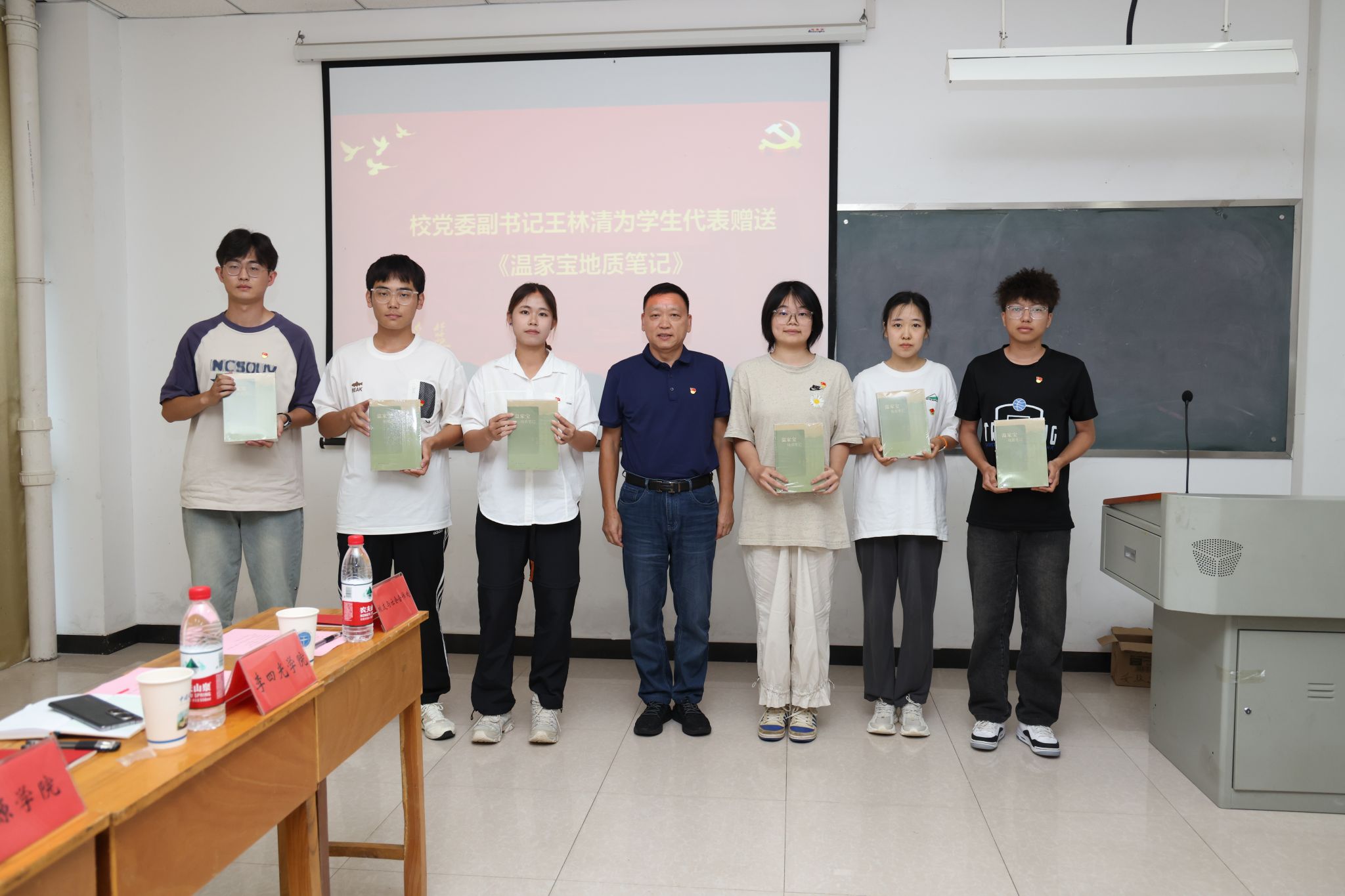 在主題黨日現(xiàn)場,王林清為學(xué)生黨員代表贈(zèng)送《溫家寶地質(zhì)筆記》。