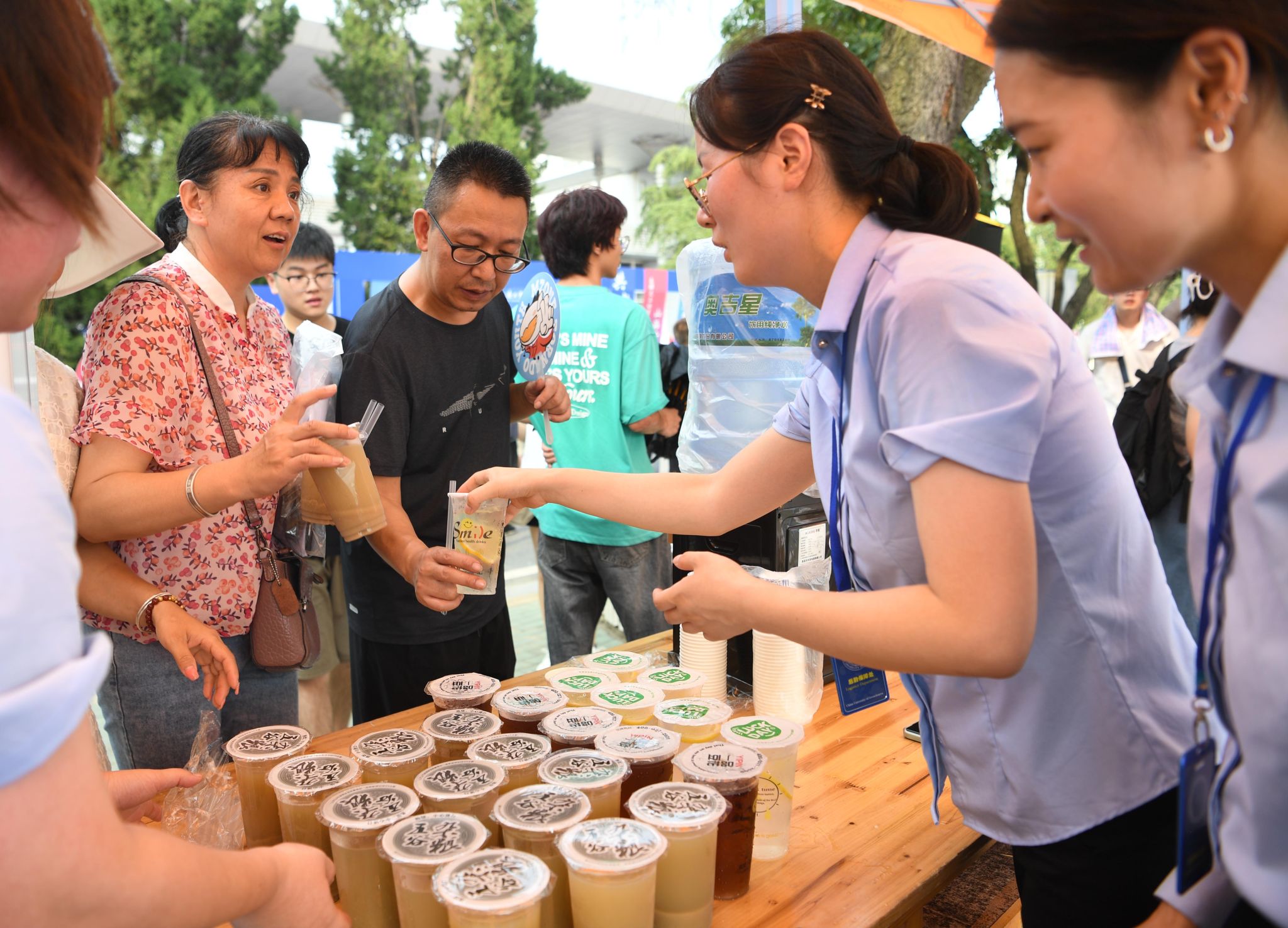 在免費飲品發放點,后勤保障部飲食服務中心的劉巖和同事們,共同參與了迎新送冷飲服務。她們表示,在炎炎夏日,為剛剛踏入大學校門的新生和家長們送上清涼的飲品,看到他們因為這份小小的關懷而露出的笑容,她和同事們的內心涌上一股滿足和喜悅,也更加堅定了為師生服務、為學校貢獻的信念。據介紹,現場一共準備了飲用純凈水、綠豆沙、酸梅湯、檸檬汁四類飲品,迎新期間不限量供應。