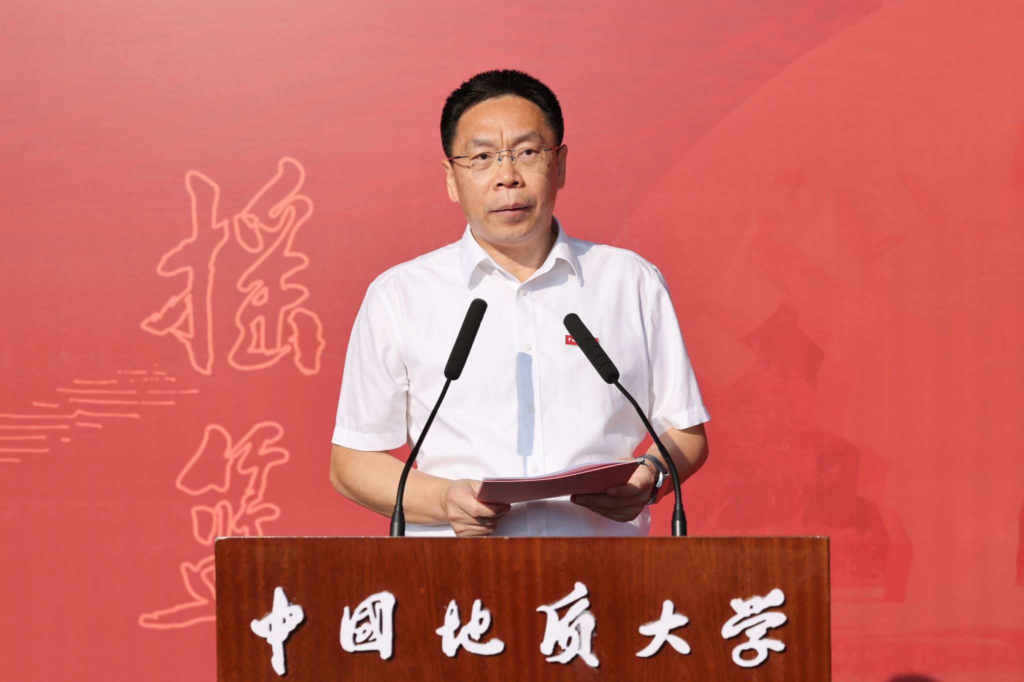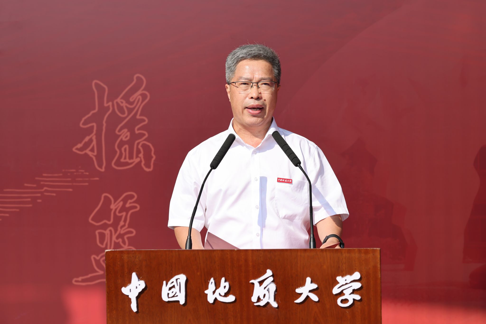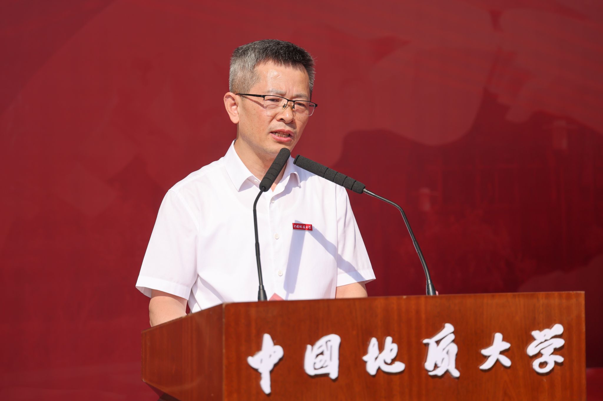 李建威向新生們介紹了地大72年風雨兼程的辦學之路,他強調,地大科技報國的初心不改,始終堅持“四個面向”,以服務資源能源安全、“美麗中國 宜居地球”建設等國家重大需求為使命,聚焦深地、深海、深空、深藍領域,積極參與國家重大專項、重大戰略工程,著力為解決區域、國家乃至人類面臨的資源環境問題提供高水平的科技和人才支撐;地大鑄魂育人的根脈不斷,始終堅守為黨育人為國育才的初心使命,始終與祖國同心、與時代同行,孕育出校訓精神、南遷辦學精神、攀登精神、“搖籃”精神,激勵著一代代地大學子仰望星空、腳踏實地、開拓創新、奮斗不止;地大勇攀高峰的腳步不停,矢志攀登自然的高峰、科學的高峰和人生的高峰,面向國家重大需求和經濟主戰場,圍繞關鍵領域開展核心技術攻關,產出了一大批重大科技成果。在探索地球科學奧秘、為祖國尋找豐富礦藏的漫漫征程中,地大人形成了特有的大歷史觀、大時空觀、大系統觀、大演化觀,塑造了放眼世界、胸懷天下的視野與格局。他希望,新一代地大人將繼續弘揚地大精神,發揚光榮傳統,厚植愛國情懷,繼續攀登和征服一座又一座高峰,奮力推進教育強國建設的地大實踐。