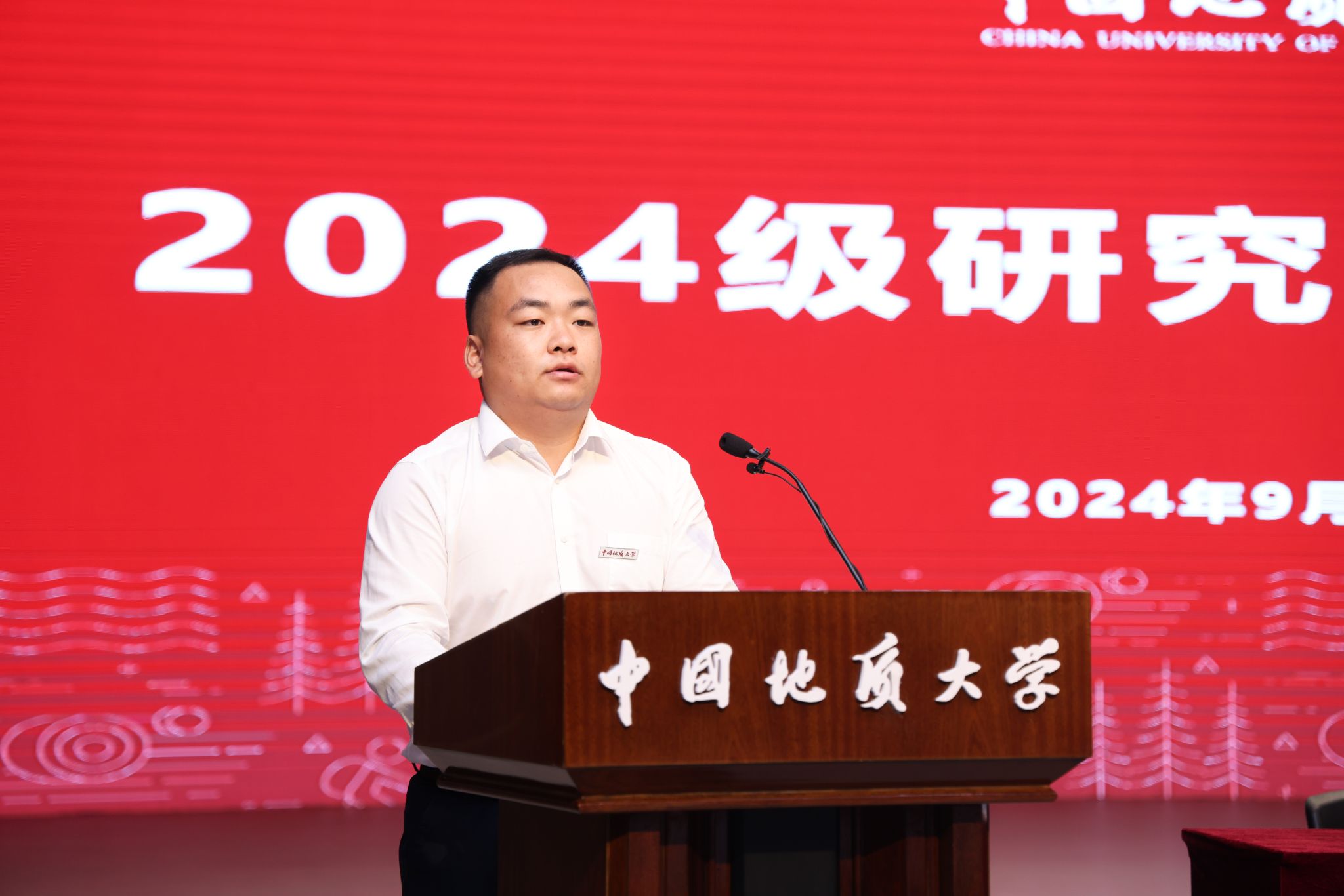 研究生導(dǎo)師代表、地質(zhì)過程與礦產(chǎn)資源國家重點(diǎn)實(shí)驗(yàn)室數(shù)學(xué)地質(zhì)導(dǎo)學(xué)團(tuán)隊(duì)主導(dǎo)師左仁廣教授發(fā)言。他說,研究生階段要學(xué)會(huì)感恩、敢于創(chuàng)新、加強(qiáng)協(xié)作,不斷傳承優(yōu)良品質(zhì),才能獲得成長。他希望正值青春年華的同學(xué)們心系家國、理必求真,做科研創(chuàng)新的寵兒;勇立潮頭,敢為人先,做突破國際學(xué)術(shù)前沿和服務(wù)國家重大需求的踐行者,用奮斗書寫屬于自己的最美畫卷。