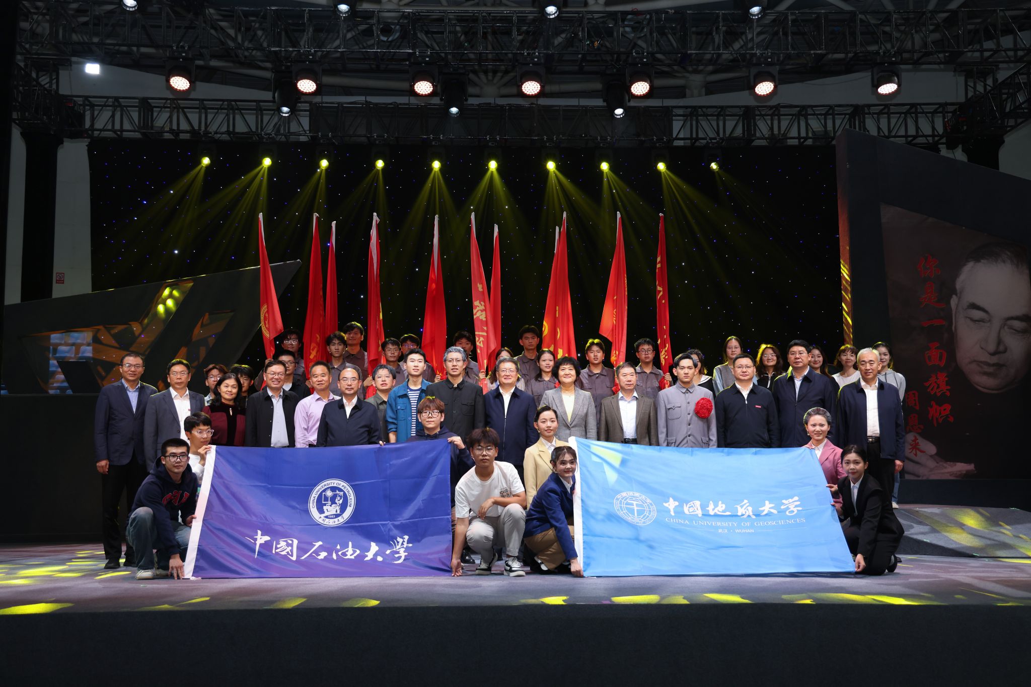 劉杰致辭并介紹話劇《大地之光》及李四光先生與地大的淵源。他講到,李四光先生是中國地質(zhì)大學(xué)的主要締造者,話劇《大地之光》選取李四光先生1950年回國后21年間,具有典型意義和矛盾沖突的歷史場景和故事,表現(xiàn)出先生的鮮明個性、科學(xué)人生和家國情懷。自2012年11月登臺首演以來,在全國巡演60余場,直接輻射觀眾10萬余人次,已經(jīng)成為中國地質(zhì)大學(xué)、中國科學(xué)家故事劇目的一張靚麗名片。他表示,在以李四光先生為代表的老一輩地質(zhì)科學(xué)家的指導(dǎo)和感召下,地大始終與黨和國家同心同向同行,建起了新中國最早的地質(zhì)高等教育體系,培養(yǎng)出以47位兩院院士為代表的30余萬名高級人才,為解決國家和人類社會面臨的資源環(huán)境問題提供高水平的人才和科技支撐。他指出,中國石油大學(xué)和中國地質(zhì)大學(xué)是同屬學(xué)科特色型大學(xué)的兄弟高校,有著相似的辦學(xué)發(fā)展歷程,相通的價值追求,在長期密切合作中結(jié)下深厚的友誼,希望此次演出為兩校攜手奮進教育強國建設(shè)新征程,扎根中國大地創(chuàng)建世界一流大學(xué)注入新的動力。