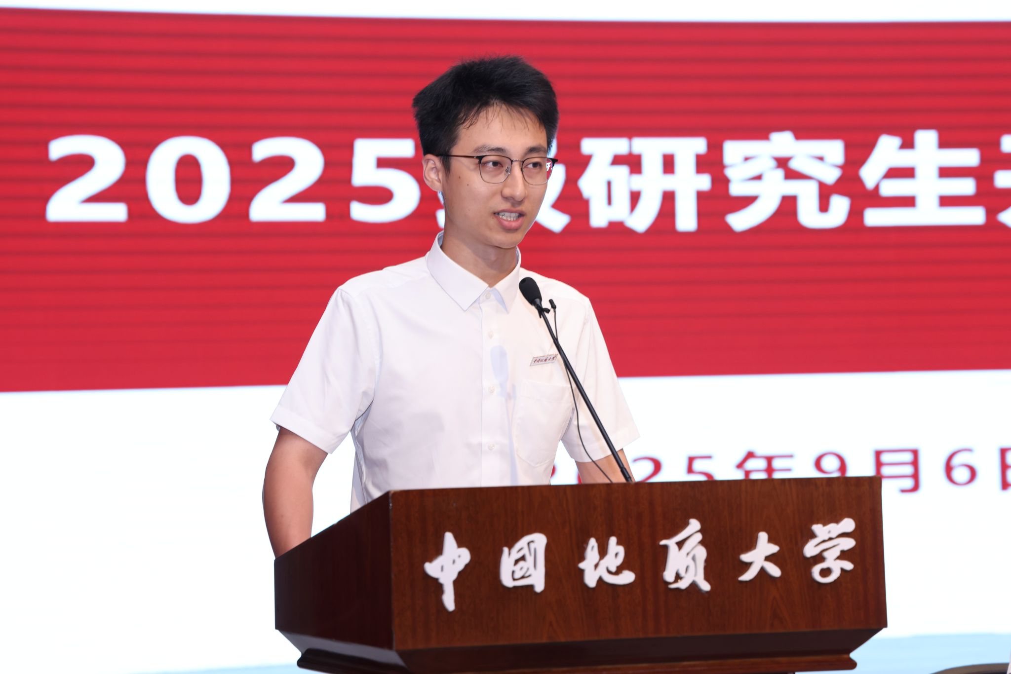 新生代表、卓越工程師學(xué)院2025級工程碩博士培養(yǎng)改革專項(xiàng)研究生余泮發(fā)言。他表示,作為工程碩博專項(xiàng)培養(yǎng)體系中的一員,將接受地大和東風(fēng)集團(tuán)的聯(lián)合培養(yǎng),心中充滿使命的厚重與前行的期待。他將扎根實(shí)踐,在解決真問題中錘煉工程能力;聚焦前沿,在交叉融合中激發(fā)創(chuàng)新活力;勇?lián)姑趪覒?zhàn)略中定位人生價值,以實(shí)踐砥礪真知,以創(chuàng)新引領(lǐng)發(fā)展,以擔(dān)當(dāng)詮釋赤誠,將個人的奮斗融入民族復(fù)興的浩蕩征程,為中國式現(xiàn)代化建設(shè)貢獻(xiàn)青春力量。