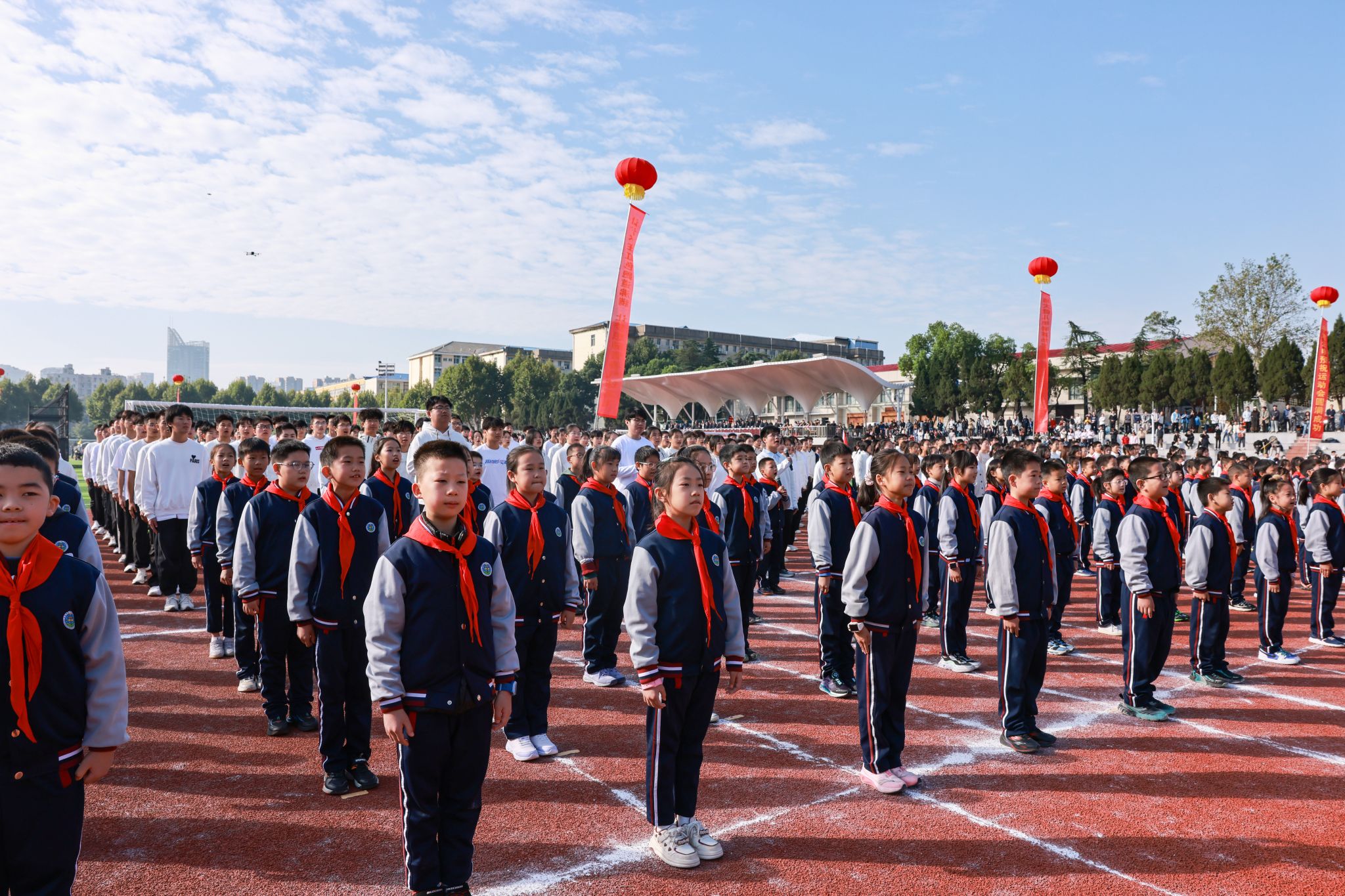現場舉行升國旗儀式,少先隊員行隊禮,全體師生肅立并行注目禮。