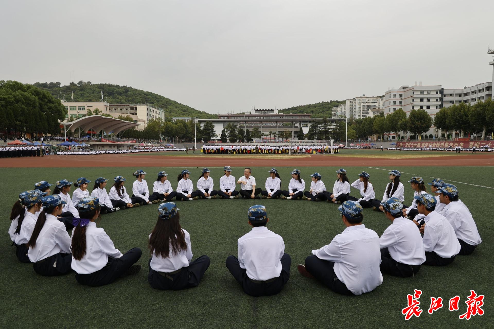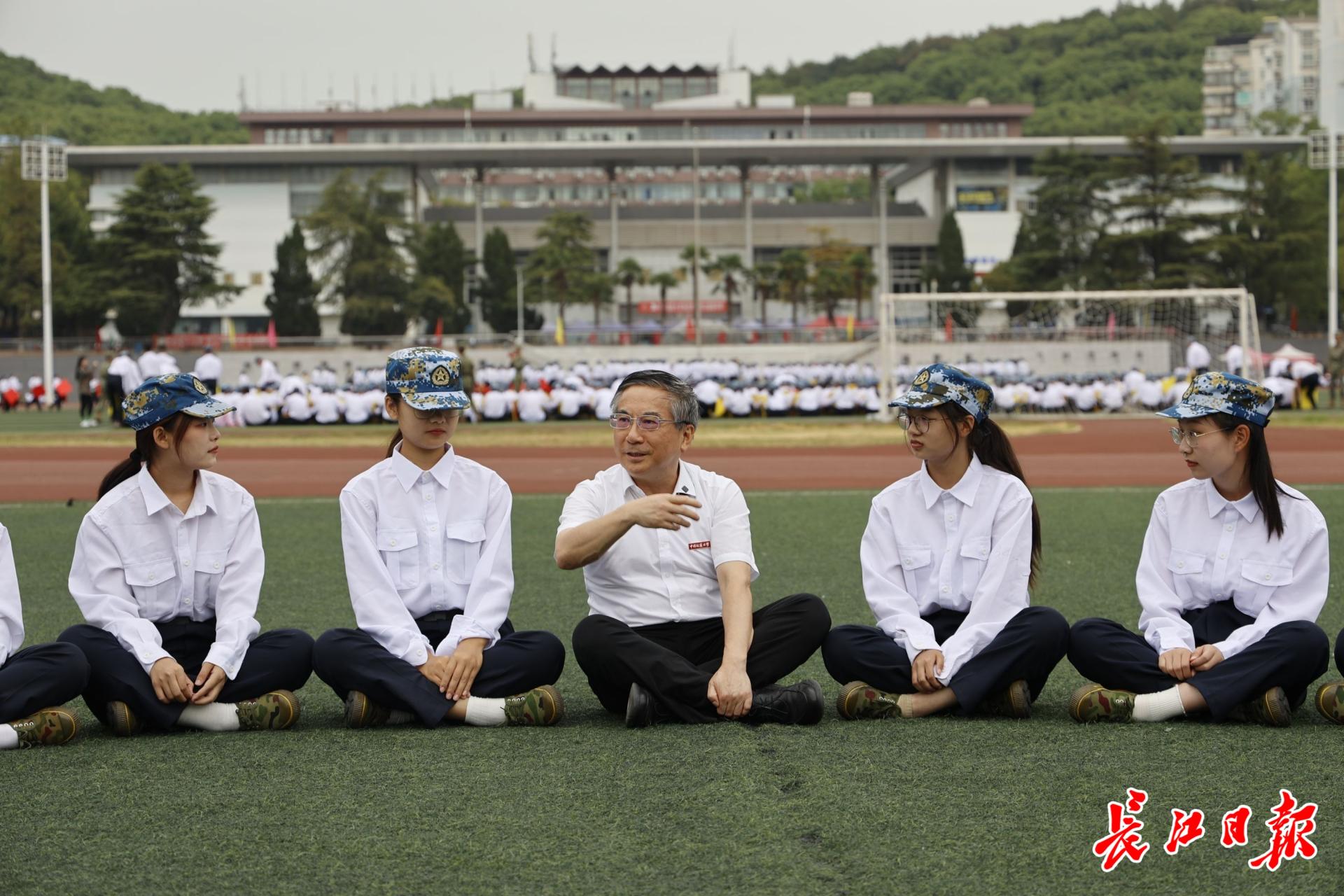 中國地質大學(武漢)校長王焰新院士和大一新生圍坐操場,講述校歌歷史,一同吟唱校歌。