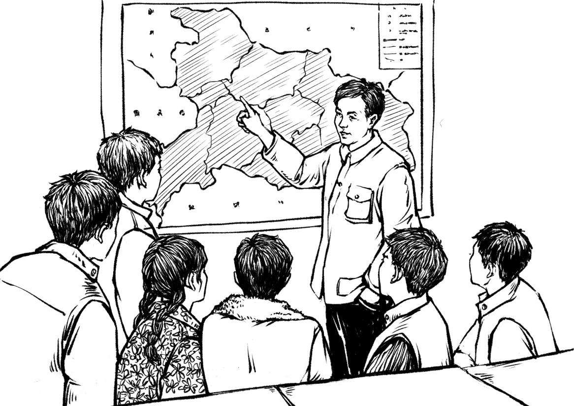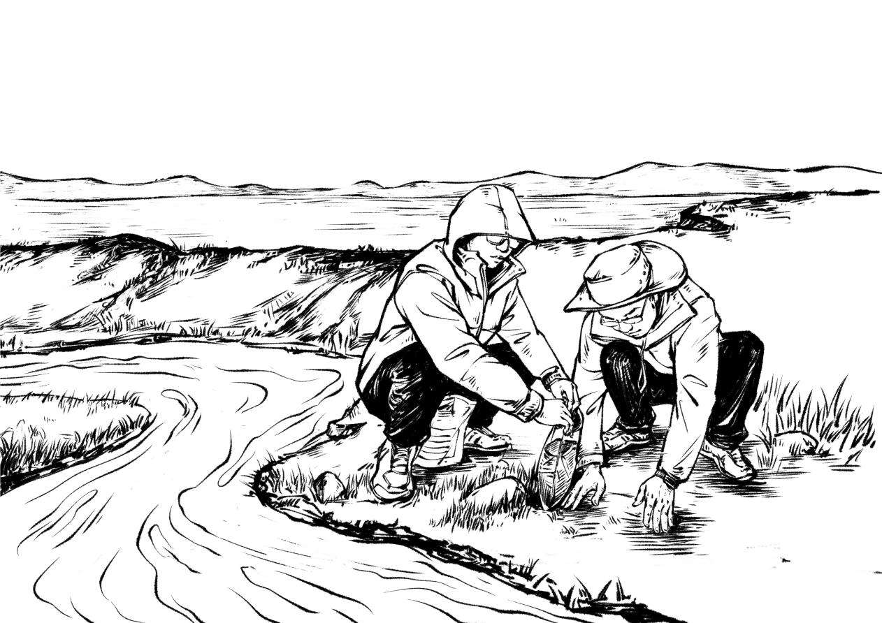 繪本《山河作證》以黑白鋼筆素描的形式,用現實主義的風格,描繪師生們野外實習和地質科考的場景。100幅畫稿中,人物造型嚴謹,動作神態逼真,場景取舍巧妙。繪本中,有的描繪老師在野外認真授課,有的描繪學生觀察地質標本,有的描繪學生采集水樣,有的描繪師生交流討論,有的則描繪在嚴寒極地從事科學考察。這些畫稿中,既有野外地質工作的歷史再現,也有最新的科學考察呈現。2022年夏天,學校組織的第二次長江源科學考察的難忘瞬間,也收入到繪本之中。此外,承載師生記憶的校園風景和建筑,在繪本中也畫了出來。