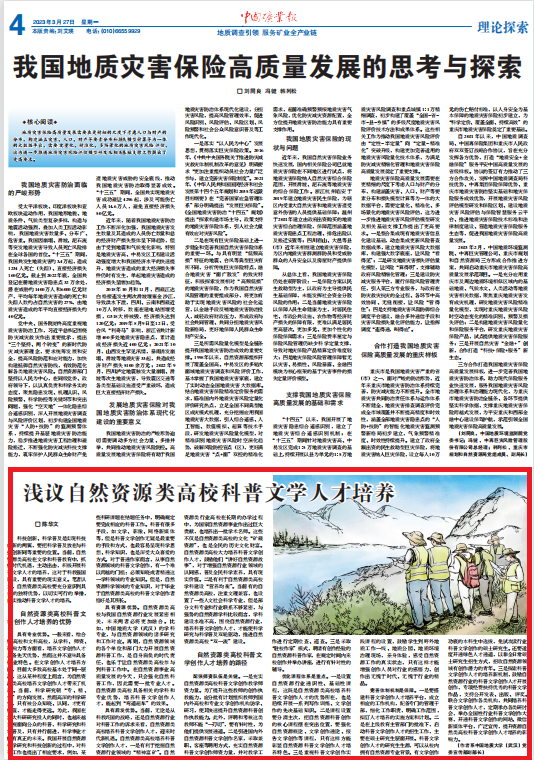 具有后發優勢。當前,無論是從科教興國的戰略,還是自然資源行業對科普工作的訴求來看,自然資源類高校培養科普文學創作人才,迎來時代新機遇。自然資源類高校培養科普文學創作人才,一是有利于挖掘自然資源行業領域的“精神富礦”。自然資源類行業高校在長期的辦學過程中,為國家自然資源事業作出過巨大貢獻,也培養出一批學術名師。這些不僅是自然資源類高校的文化“礦藏資源”,也是全民的歷史文化財富。自然資源類高校大力培養科普文學創作人才,鼓勵他們“講好自然資源故事”,對于增強自然資源行業領域的認同感,普及全民科學素養,具有現實價值。二是有利于自然資源類高校學科建設“營養均衡”。當前有的自然資源類高校,注重文理兼容,也設置了一些人文社會科學專業,但是部分文科專業和行業聯系不夠緊密,與強勢的自然資源學科比較而言,學科建設水準不高,圍繞自然資源行業,培養科普文學創作人才,才能使科學研究與科學普及雙輪驅動,推進自然資源類高校“雙一流”建設。