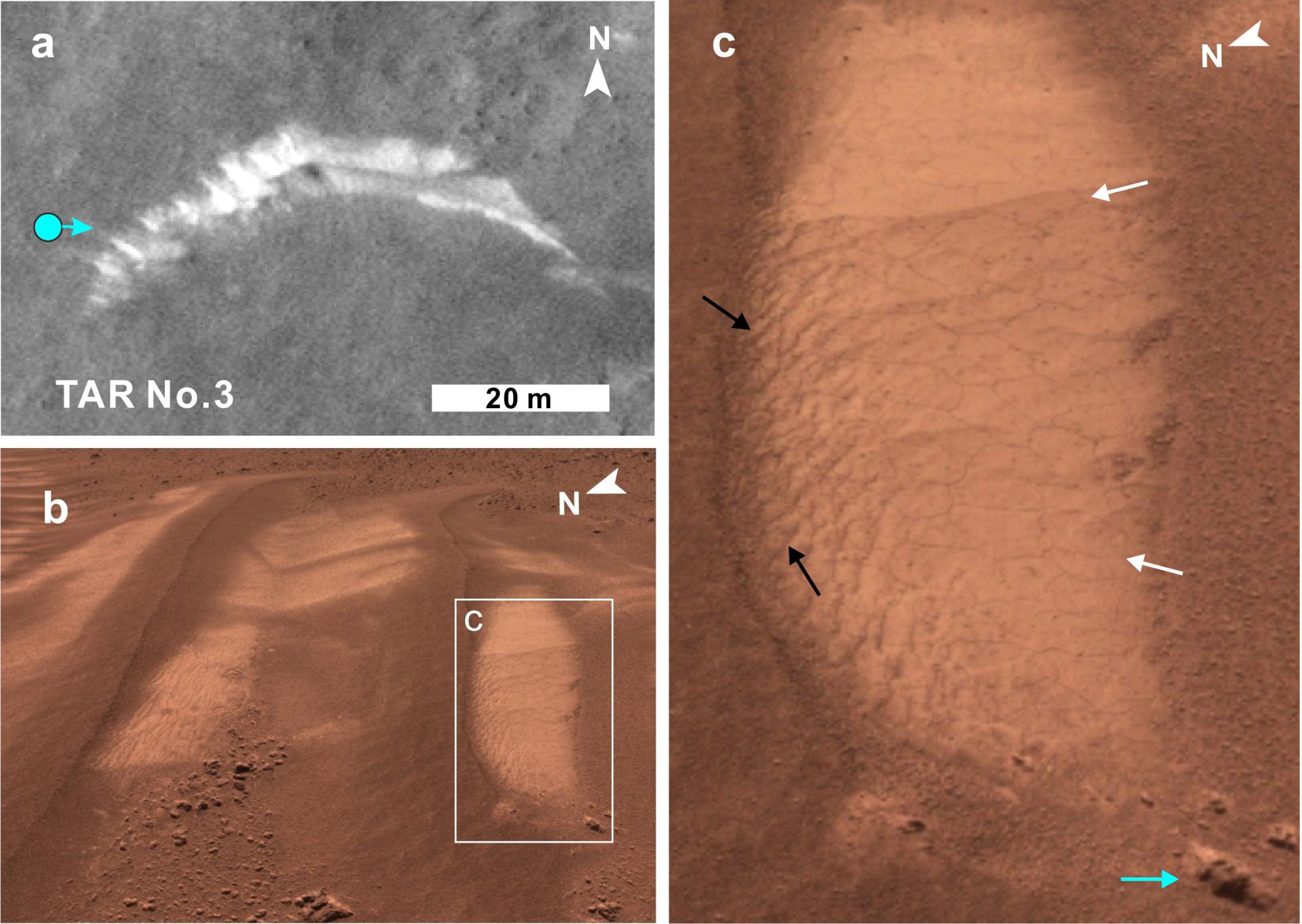 (作者 溫才妃 余淳梅)近日,中國地質大學(武漢)教授肖龍團隊研究成果《火星近期水活動:來自祝融號著陸區烏托邦平原橫向風成脊的證據》以封面文章形式發表在《地球物理研究通訊》。研究團隊首次在火星橫向風成脊表面識別出小型多邊形裂隙,研究發現裂隙分布區的表面可能存在石膏等含水硫酸鹽礦物,為了解火星表面水活動,評估當前火星的宜居性這一關鍵科學問題,提供了新線索。