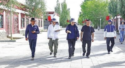 探訪調研團與長江源村黨員干部一道,走在長江源村寬敞整潔的馬路上。