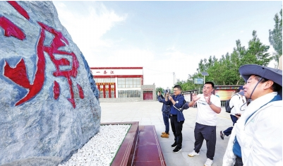 7月22日,格爾木市長江源民族學校校長李軍(左三)為“沿著長江讀懂中國——萬里長江行”探訪調研團講解該校以生態文明為特色的校園文化。