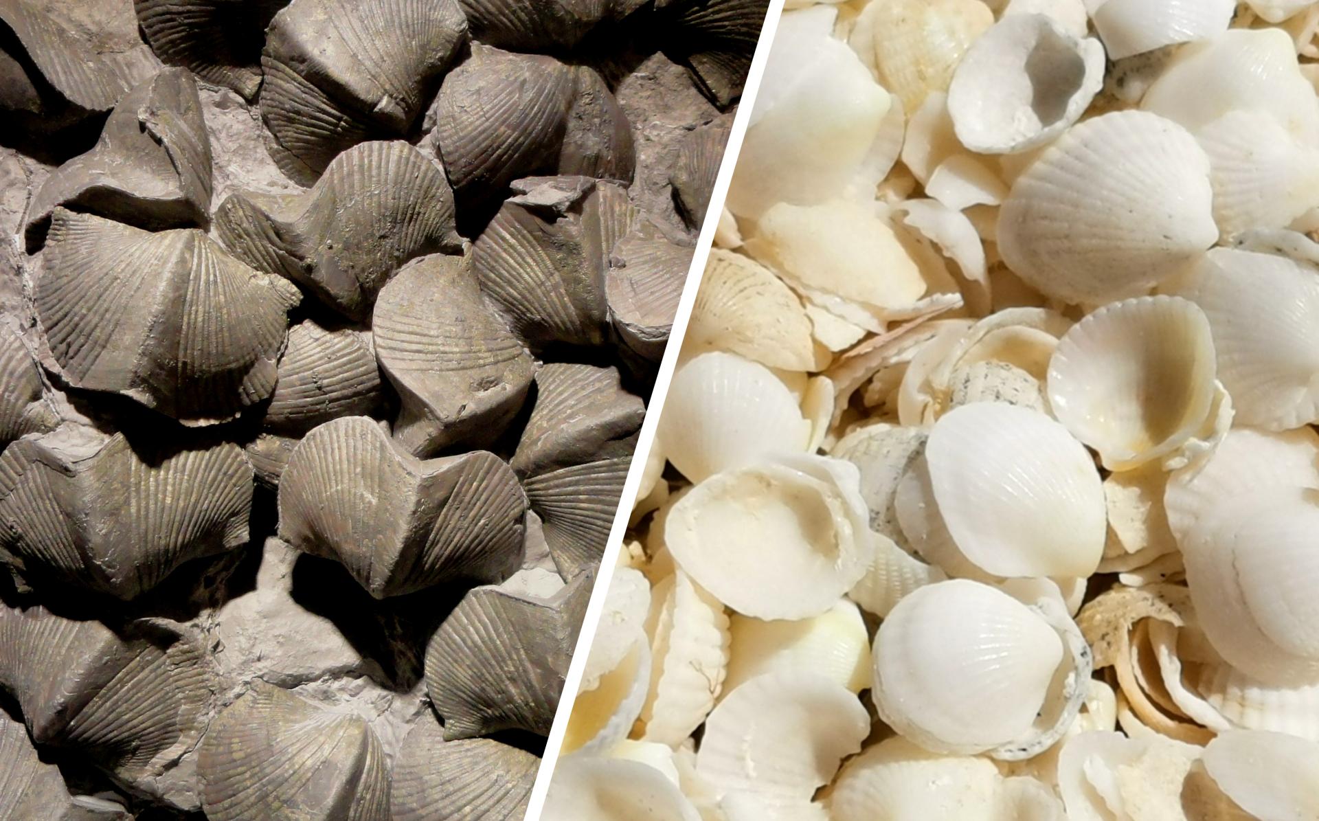 左圖:美國(guó)泥盆紀(jì)腕足類化石。圖片源自Daderot(Wikimedia Commons)。右圖:西澳大利亞貝殼灘(shell beach)的現(xiàn)代雙殼類。(受訪者供圖)。