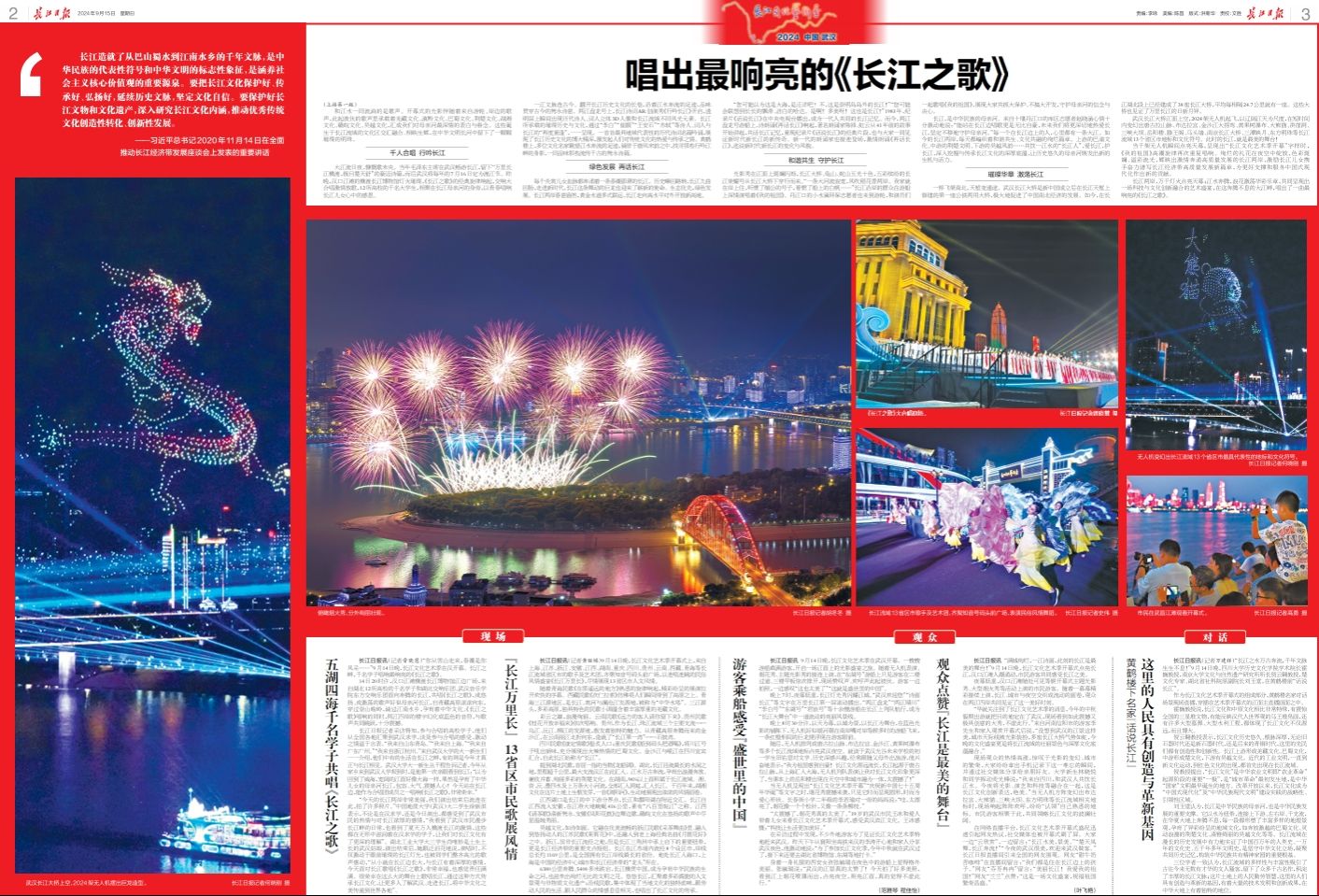 “今天的長江兩岸非常美麗,我們演出結束后流連在此,拍了許多照片?!敝袊刭|大學(武漢)大二學生徐新淇表示,不論是在漢求學,還是今日演出,都感受到了武漢市民的熱情與對長江濃厚的感情,“我看到了武漢市民漫步長江畔的日常,也看到了夏天萬人橫渡長江的激情,這些都在無形中滋潤著在漢求學的學子,讓我們對長江文化有了更深的理解”。湖北工業大學大三學生肖唯妙是土生土長的武漢姑娘,演出結束后,她眼泛淚花地說,演唱時,不僅激動于眼前璀璨的長江燈光,也被同學們整齊高亢的歌聲感動,“從小就在長江邊長大,與長江有著深厚的感情,今天面對長江歌唱《長江之歌》,非常幸福,也感覺責任滿滿。很榮幸在這么大的舞臺上歌唱長江,通過這種方式傳承長江文化,讓更多人了解武漢、走進長江,將中華文化之美傳遞到世界各地”。