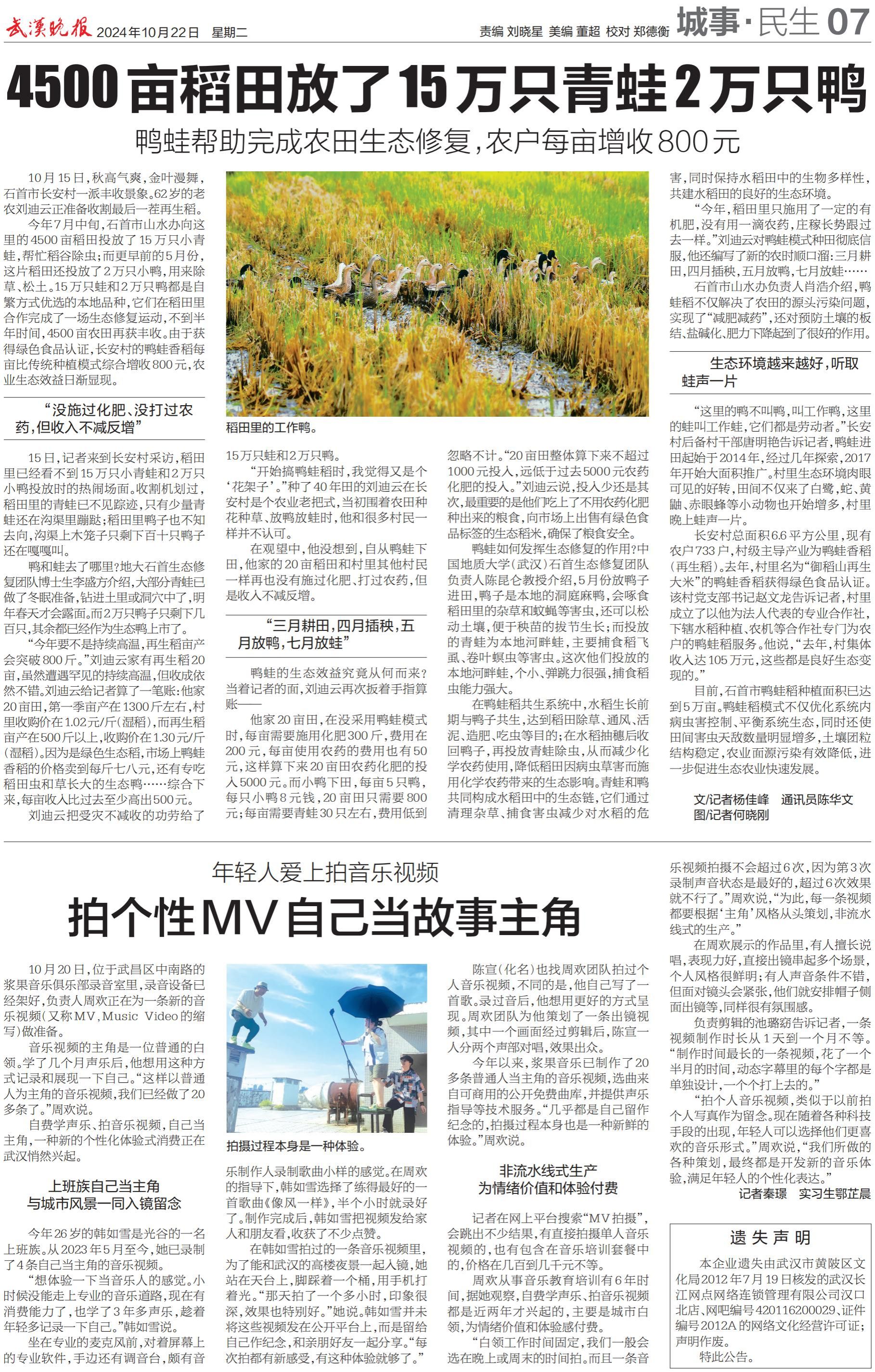 鏈接:武漢晚報-4500畝稻田放了15萬只青蛙2萬只鴨