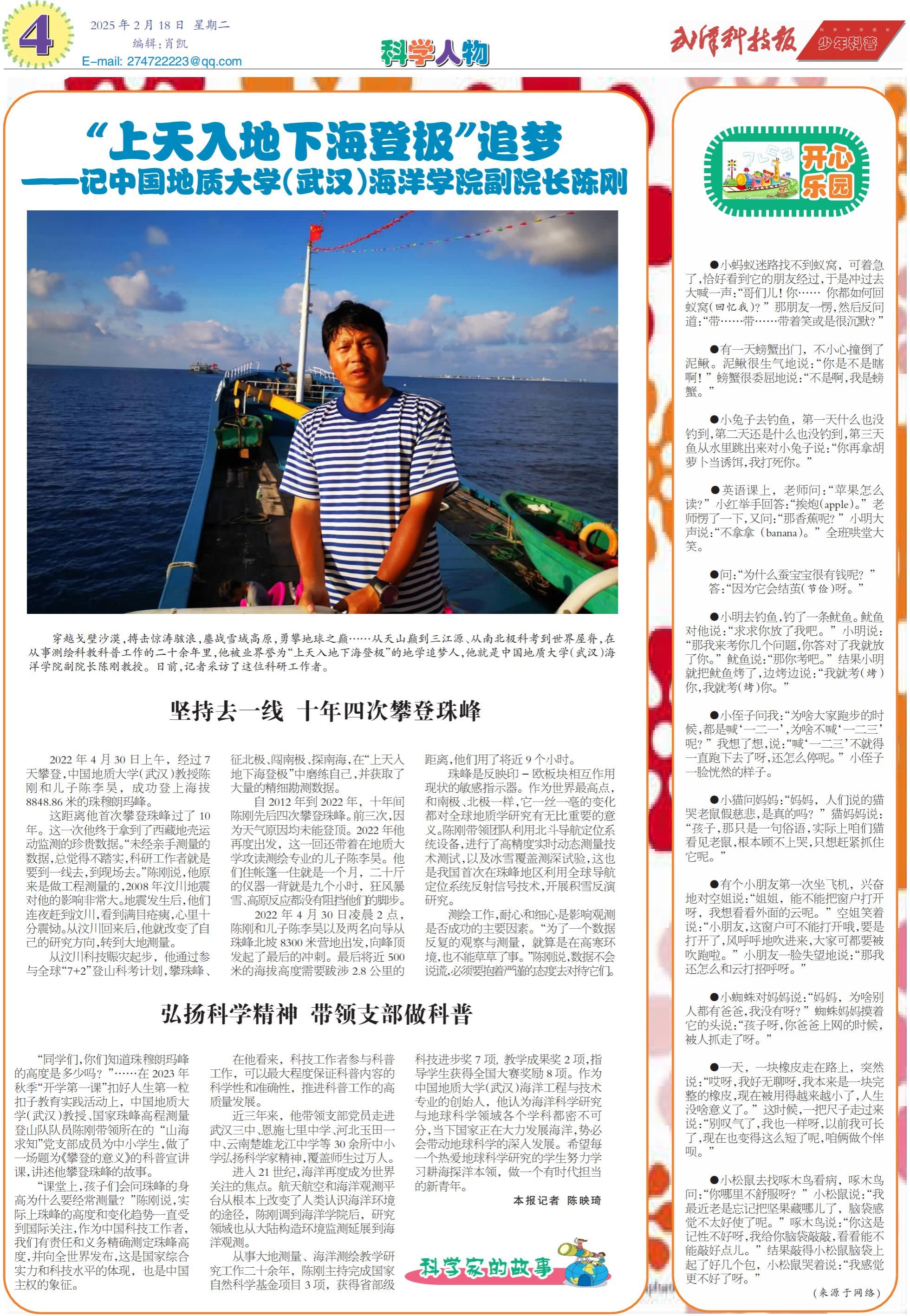 穿越戈壁沙漠,搏擊驚濤駭浪,鏖戰雪域高原,勇攀地球之巔……從天山巔到三江源、從南北極科考到世界屋脊,在從事測繪科教科普工作的二十余年里,他被業界譽為“上天入地下海登極”的地學追夢人,他就是中國地質大學(武漢)海洋學院副院長陳剛教授。日前,記者采訪了這位科研工作者。
