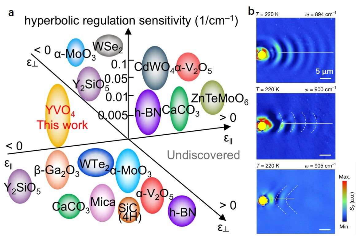 (a)傳統(tǒng)雙曲材料與釩酸釔晶體的介電張量符號關系及雙曲范圍;(b)基于釩酸釔晶體的溫度驅動光學拓撲轉變
