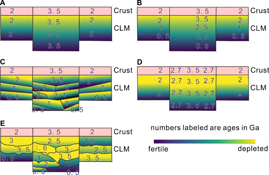 圖 1. 不同增生方式產生的巖石圈地幔成分和年齡結構。A:快速的地幔柱或者俯沖作用所致。B:冷卻或者巖漿作用相關的底墊作用所致。C:俯沖疊置所致。D:側向增生所致。E:本研究所述的拆沉-浮合模型所致。A-D產生的巖石圈具有特定的年齡結構(上老下新或者整體年齡相近)。E模型會產生古老巖石圈地幔底墊于年輕巖石圈地幔之下或鑲嵌于年輕巖石圈地幔內部的復雜巖石圈結構。
