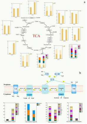 宏基因組學數據顯示四環素對反硝化相關代謝過程關鍵基因的復制有抑制效果,包括三羧酸循環中生成ATP和電子供體的功能基因、電子傳遞系統相關基因、反硝化功能基因。