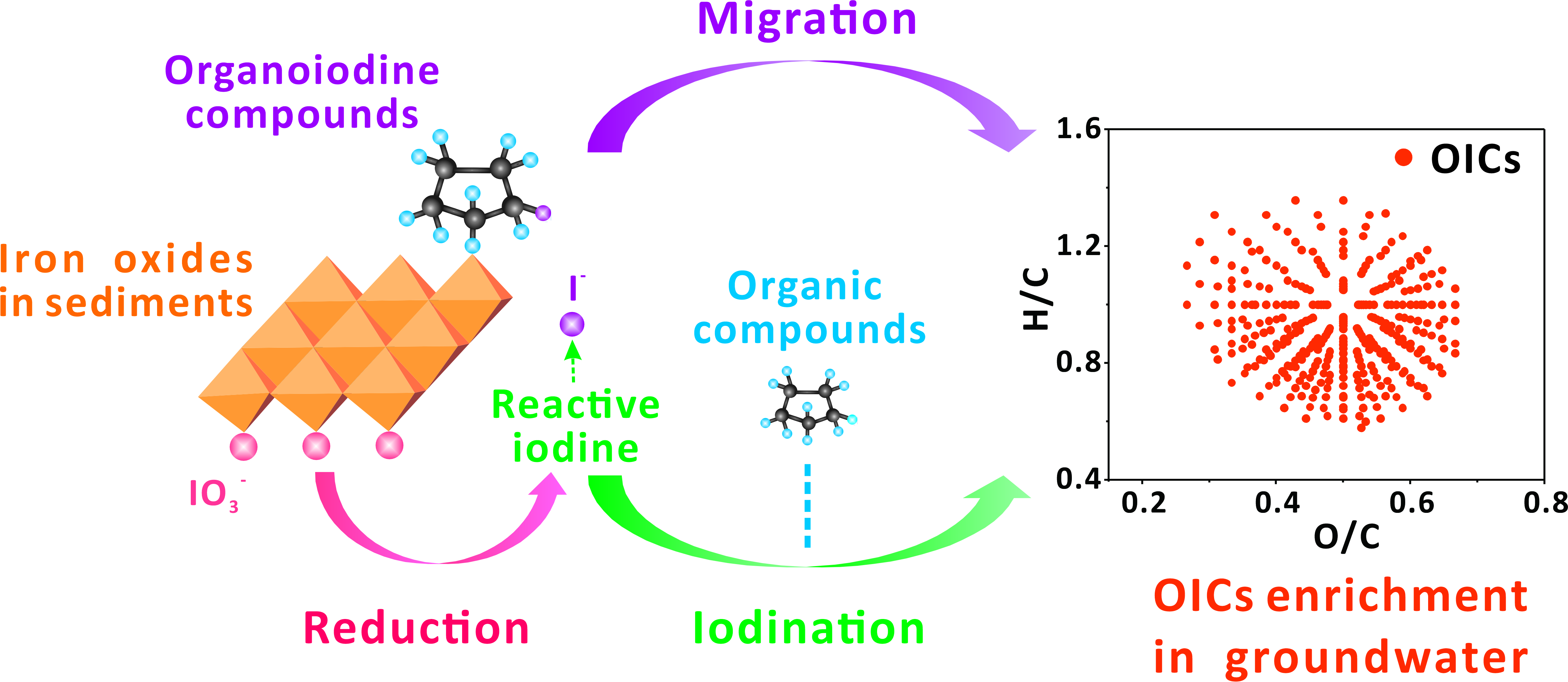長(zhǎng)期攝入高碘地下水(碘濃度>100μg/L)會(huì)造成人體甲狀腺機(jī)能損傷。水源性高碘甲腫已成為全球普遍存在的環(huán)境健康問題。地下水系統(tǒng)中的碘通常以無機(jī)碘(碘離子和碘酸鹽)和有機(jī)碘的形態(tài)存在。有機(jī)碘化合物是無機(jī)碘與天然有機(jī)質(zhì)結(jié)合的產(chǎn)物,具有強(qiáng)細(xì)胞毒性和基因毒性,其形成機(jī)制與控制方法在消毒副產(chǎn)物研究中備受關(guān)注。然而天然地下水環(huán)境中有機(jī)碘化合物的來源與形成機(jī)制尚不清楚,與鐵礦物結(jié)合有機(jī)質(zhì)介導(dǎo)的碘形態(tài)轉(zhuǎn)化研究十分有限,天然地下水中有機(jī)碘化合物的環(huán)境健康風(fēng)險(xiǎn)仍存在諸多不確定性。
