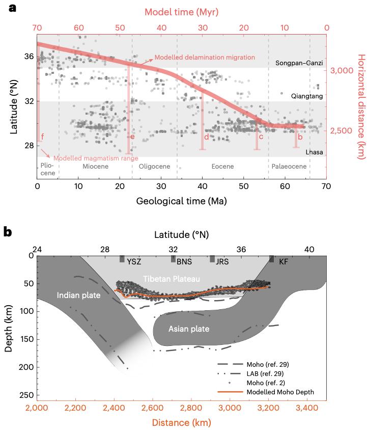 青藏高原的隆升具有三大一階特征,包括高原的多階段隆升,新生代巖漿活動的北向遷移以及高原底部地震波低速異常。巖石圈地幔拆沉所伴隨的地表響應解釋了高原的古高度研究結(jié)果以及巖漿活動的北向遷移模式 (圖2c,d和圖3a)。同時,巖石圈地幔拆沉的結(jié)果與現(xiàn)今高原底部巖石圈結(jié)構(gòu)一致,包括地震層析成像顯示的地震波低速異常和接受函數(shù)圖像揭示的雙向結(jié)構(gòu)與地殼厚度 (圖3b)。這些對比有力地證明了,上覆板塊巖石圈地幔拆沉這一動力過程塑造了整個印度—歐亞板塊碰撞體系,是青藏高原生長背后的驅(qū)動力,同時該深部動力過程的提出,也為地球歷史上富巖漿活動的造山事件提供了新的地球動力學解釋。