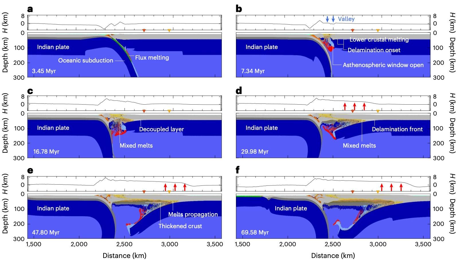 覆板塊發(fā)生的巖石圈地幔拆沉的數(shù)值模擬結(jié)果,顯示了歐亞板塊的巖石圈地幔從巖石圈中剝離的過程并造成了青藏高原的隆升(圖1)。這一過程的發(fā)生來源于印度板塊脫水形成的部分熔融物質(zhì)的上涌與聚集,在弧前與弧后區(qū)域形成了一個軟流圈窗口。通過該窗口,軟流圈物質(zhì)、部分熔融物質(zhì)與地殼接觸,并侵入莫霍界面,觸發(fā)了巖石圈地幔拆沉。隨著印度板塊的持續(xù)推擠,部分熔融物質(zhì)沿著莫霍界面向歐亞板塊腹地遷移,將巖石圈地幔逐步剝離。這一過程使得歐亞板塊地表逐步抬升,最終形成一個青藏高原(寬度超過1000 千米,高度超過4 千米)。在印度板塊向下俯沖的過程中,由于地殼增生與浮力作用,抬升了高原的前端區(qū)域并且造成青藏高原的地殼增厚。