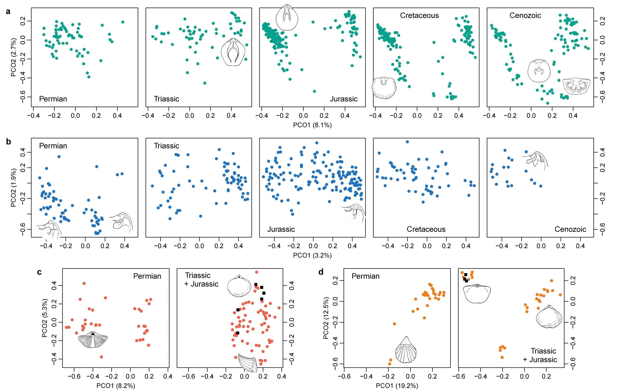 為解決上述問題,研究團(tuán)隊(duì)對(duì)中—新生代四個(gè)主要腕足動(dòng)物目進(jìn)行了詳細(xì)的形態(tài)特征編碼,編制了包含一千余屬的特征矩陣,涵蓋了中—新生代95%以上的腕足動(dòng)物屬;通過對(duì)全新形態(tài)數(shù)據(jù)的分析,評(píng)價(jià)了這四個(gè)目在過去三億年間(二疊紀(jì)到第四紀(jì))形態(tài)空間與形態(tài)差異度的變化。