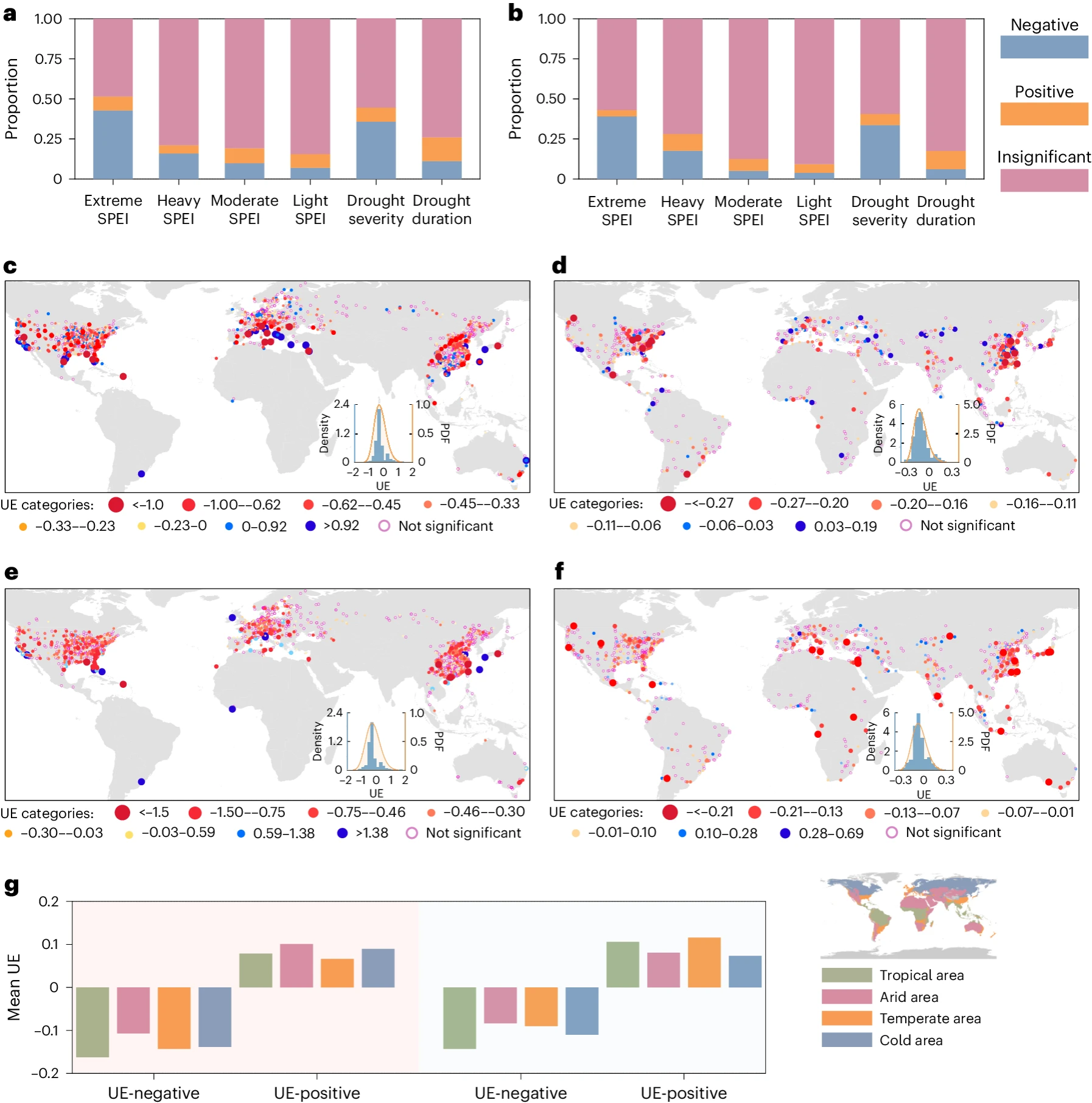 圖1 全球城市化對不同局地干旱指標的影響及分布