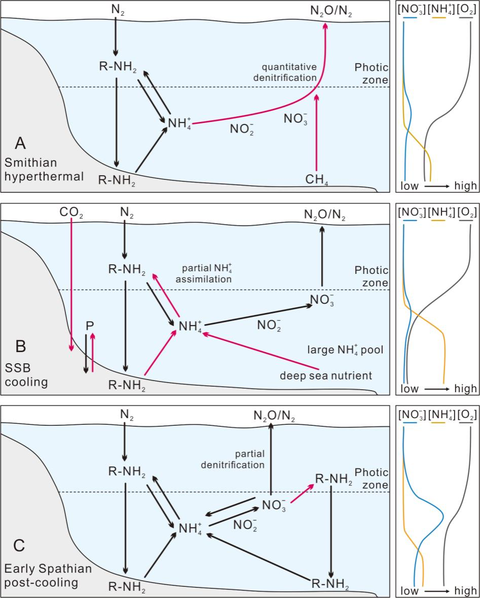 圖1 華南早三疊世Smithian-Spathian之交的氮循環(huán)演化機(jī)理模型