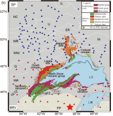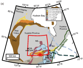 形成于約11億年前的北美中陸大裂谷系統(Midcontinent Rift, MCR)是存在于太古宙勞倫大陸蘇必利爾省內發育失敗的大陸裂谷,是北美大陸中部重要的前寒武地質特征之一。裂谷時期出露于蘇必利爾湖附近的大量的火成巖,被認為是先存結構的再活化、基維諾地幔柱的上涌和減壓熔融、或異常熱/富集地幔的上涌共同作用的結果。東、西兩支相交的裂谷分支橫跨太古宙和古元古代單元;西側分支向西南延伸約2000公里,東側分支被格林維爾造山帶截斷。MCR與地幔柱上方大陸裂谷的經典三分支相交模型(three-arm model)形成鮮明對比,即向北的第三裂谷分支或拗拉槽的缺失,以及東西兩相交的裂谷分支偏離推斷的地幔柱中心約300公里等問題,尚未得到很好的理解。