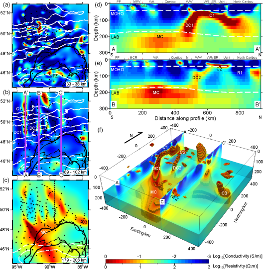 圖2 MT 三維反演得到的優選電阻率模型。(a-c)33-38千米、89-102千米和179-206千米深度的水平切面。黑圈表示MT臺站,粗黑實線表示MCR,白線表示子省邊界。(c)中的黑色虛線表示東蘇必利爾低速區的西部邊界。(d)和(e)為垂直剖面A-A'和B-B',其位置如(b)所示。白色虛線表示地震結果推斷的莫霍面和LAB界面。(f)20千米深度以下低電阻率異常(≤10Ω.m)透視圖。剖面A-A'和C-C'的位置見(b)。C表示高導體,R表示高阻體。