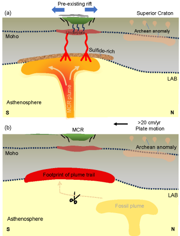圖3蘇必利爾湖周圍地下巖石圈底部導電異常形成的可能模式。綠色為火山巖。(a)蘇必利爾省的一段巖石圈富含硫化物,基威諾地幔柱對蘇必利爾湖周圍巖石圈的撞擊為礦物顆粒間硫化物的相互連接提供了潛在的機制,從而產生了觀測到的高導電性特征。在地幔柱充擊過程中,先前存在的裂谷區域被重新激活,從而在蘇必利爾湖周圍形成了洪積玄武巖巖漿活動、地殼底侵、基性-超基性侵入體以及富硫化物礦床。蘇必利爾省內的零散MT異常很可能是由于太古宙熱液流和巖漿噴發造成的。(b)在MCR形成期間,勞倫大陸以大于20厘米/年的速度向南(按現在的方向)快速運動,切斷了與地幔柱的聯系,留下了區域性的 NW-SE 走向的高導跡線。