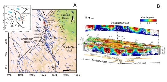 圖1.安寧河-則木河斷裂構(gòu)造背景圖(A)和反演的斷層精細(xì)閉鎖率分布(B)。圖A中黑線表示區(qū)域活動(dòng)構(gòu)造斷裂,藍(lán)色箭頭表示GNSS速度場。圖B表示反演得到的斷層閉鎖率分布,從藍(lán)色到紅色表示斷層閉鎖程度逐漸增加。