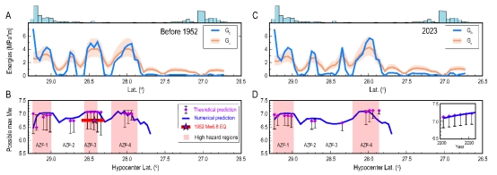 圖3. 基于斷層閉鎖狀態(tài)和震源物理理論評(píng)估的安寧河-則木河斷裂的地震潛能。圖A表示1952年M6.8地震前積累的彈性能和破裂能,圖B表示1952年地震前斷層的地震潛能。圖C-D與圖A-B類似,但表示現(xiàn)今的情況。圖片最上面表示地震活動(dòng)性分布情況。