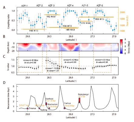 圖 2. 圖A表示平均斷層閉鎖率沿走向的變化,橙色線段表示歷史地震破裂范圍(Wen et al.,2008). 圖B和C表示自上次強(qiáng)震發(fā)生后至今積累的剪切應(yīng)力與b值的比較。圖D表示根據(jù)斷層閉鎖率和破裂動(dòng)力學(xué)理論估算的地震復(fù)發(fā)周期(黑線)與地震地質(zhì)探槽結(jié)果(紅色條棒)之間的對(duì)比。