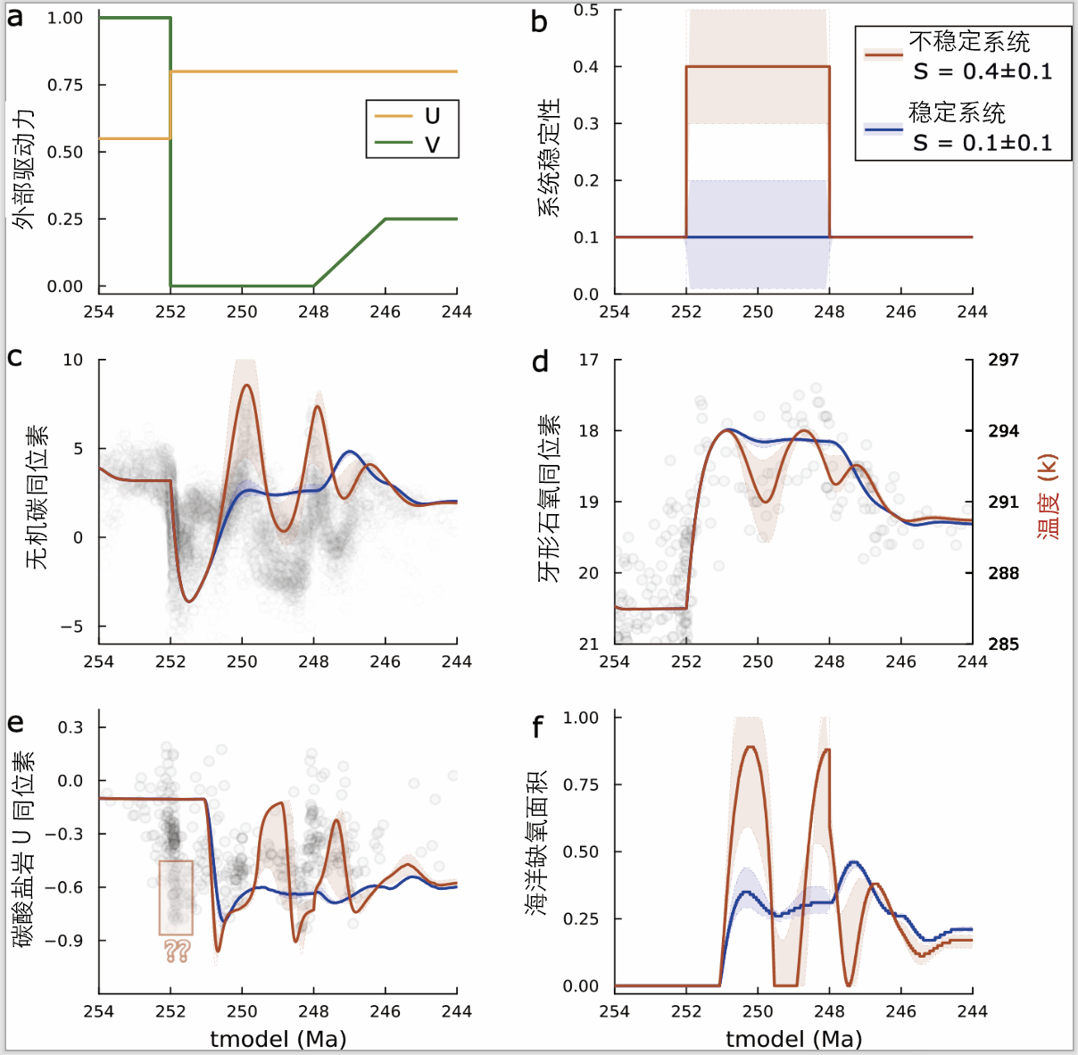 圖2.二疊紀大滅絕后環境波動與模擬結果的對比(時間序列模式)。