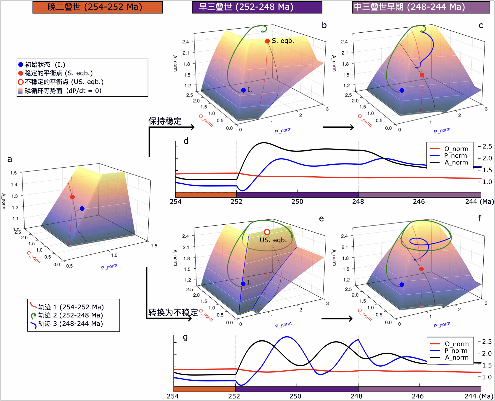 圖3. 三疊紀早期磷-氧-碳循環波動(三維相圖分析)。a:二疊紀穩定系統,b-d:三疊紀穩定系統,e-g:三疊紀不穩定系統