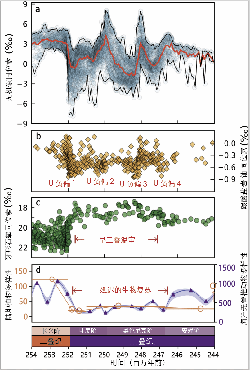 圖1.二疊紀大滅絕后顯著的生物地球化學循環波動與延遲的生物復蘇,圖為由同位素地球化學指標(比如無機碳同位素、牙形石氧同位素,碳酸鹽巖鈾同位素等)表達的多種環境因子出現長達600萬年劇烈震蕩時期。