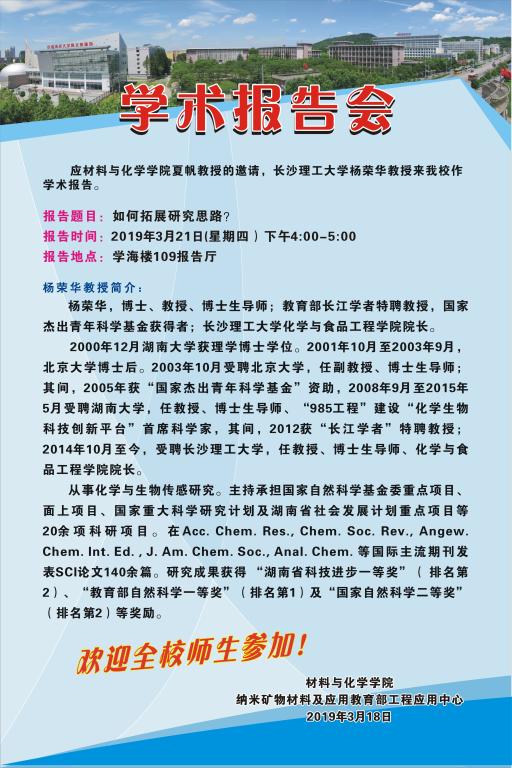 [3月21日]材化學術論壇:長沙理工大學楊榮華教授學術報告