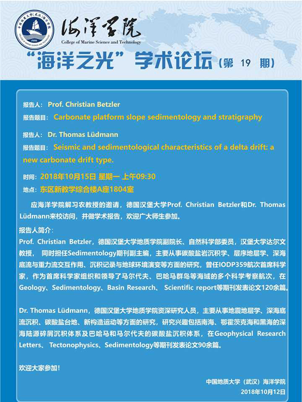 [10月15日]海洋之光學術論壇:德國漢堡大學Prof.Christian Betzler和Dr.Thomas Ludmann學術報告